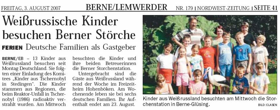 Quelle: NORDWEST- ZEITUNG Berne/Lemwerder Titel: Weißrussischer Kinder besuchen Berner Störche vom: 03.08.2007 Autor: unbekannt Foto: Clasen